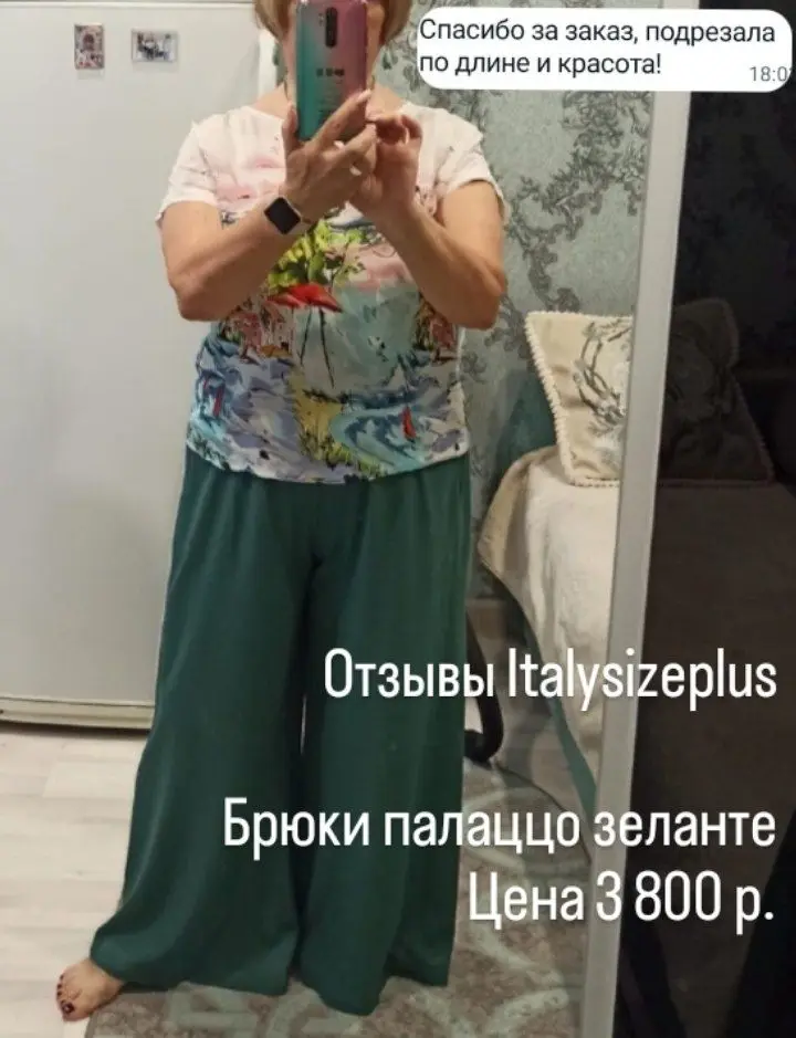 Получила первый свой заказ: палаццо в цвете изумруд.На мои параметры: ОБ113, ОЖ95,От83 и рост 168 сели отлично: свободно, но вместе с тем ничего не слетает и визуально очень стройнит.❤