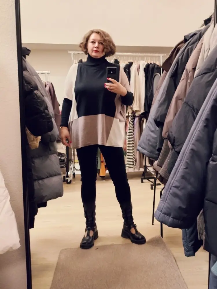 Свитер очень тактильно приятный, не жаркий , прикрывает всё , что нужно прикрыть , можно миксовать с разным низом !!! очень рекомендую!! Очень прошу Оксану сделать такой же свитер, но убрать черный цвет от лица, , так как девушкам 50+ не желательно носить черный цвет именно у лица . Поменять местами эти цветные фигуры местами , черный спустить вниз , а бежевый сделать у лица . Будет освежать . Очень удачная модель свитера !!!!!
